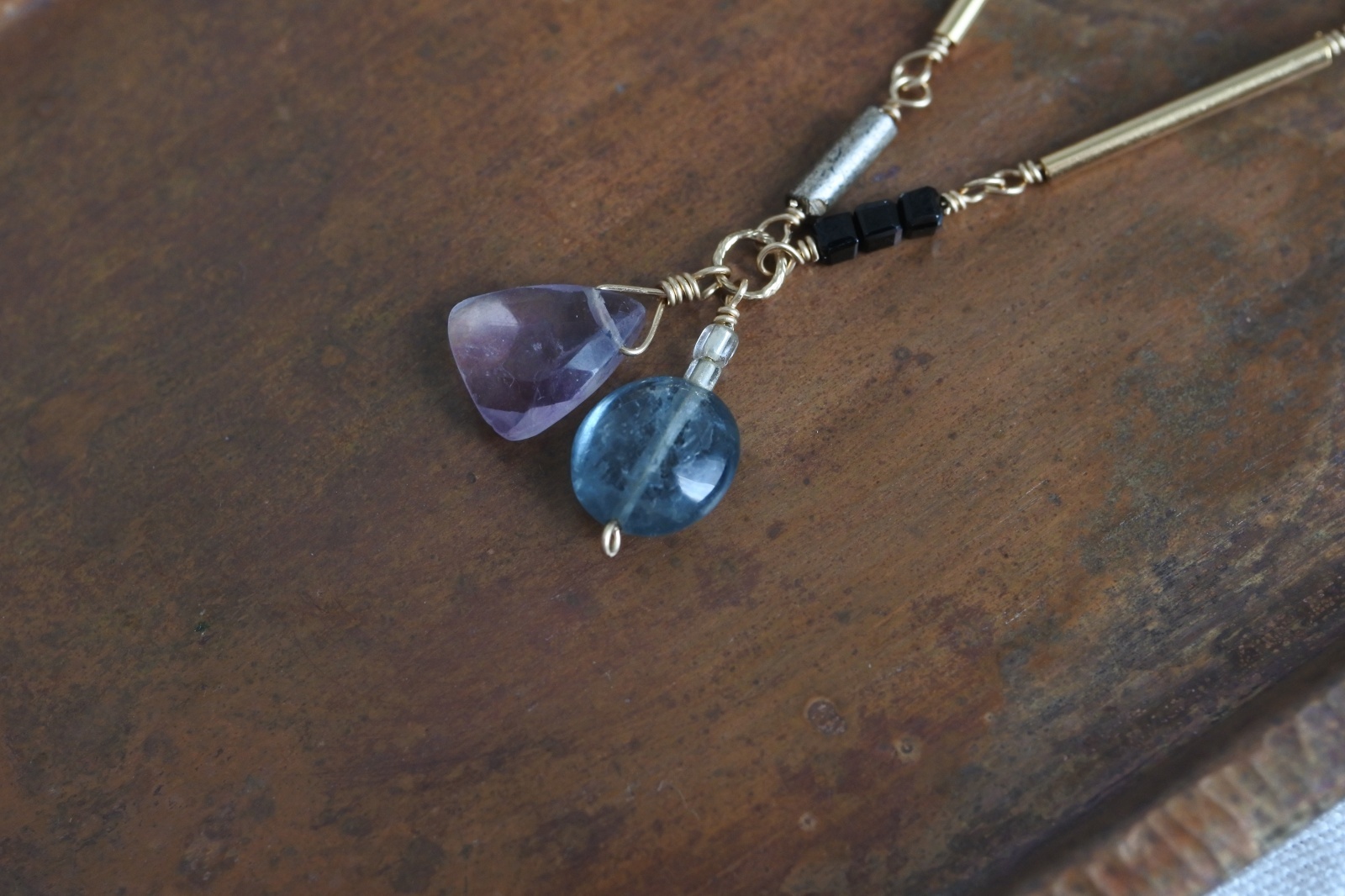 トップには海のように神秘的な青を閉じたトルマリンと、淡い光をふわりと含むフローライトを合わせました。